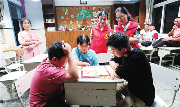 7月24日,湖州市德清縣阜溪街道紀工委組織志愿者來到三橋小學臨時安置點開展愛心陪伴行動,和小朋友們一起下象棋、看圖書!盁熁ā迸_風來臨,阜溪街道對危險地段群眾進行安全轉移,設立臨時安置點,免費提供食宿,黨員志愿者跟蹤服務,讓轉移群眾生活無憂。(謝尚國)