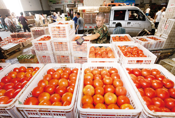 連日來,金華市婺城區羅店鎮盤前村村民把收獲的高山番茄運到市農產品批發市場銷售。當前正是盤前高山番茄上市時節,每天有10多噸銷售到市區和杭州、紹興等地。盤前村平均海拔1000多米,海拔高、晝夜溫差大,產出的高山番茄口感好,深受消費者青睞。(時寬兵)