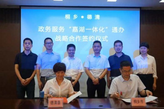 在桐鄉市政務數據辦、長三辦的推動下,8月4日上午,嘉興桐鄉市、湖州德清縣兩地政務服務部門簽訂了政務服務“嘉湖一體化”通辦戰略合作框架協議,兩地將在桐鄉市洲泉鎮、河山鎮、大麻鎮與德清縣新市鎮、禹越鎮便民服務中心分別設立“嘉湖一體化”互通互辦專窗,為企業和群眾提供綜合性、一站式服務。