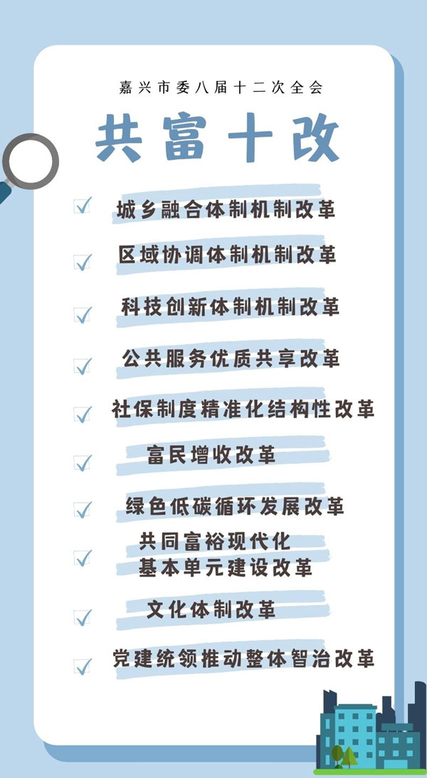 全會明確了嘉興要打造高質量發展建設共同富裕示范區的典范城市,強調未來五年嘉興要深入實施“八大行動”、全面推進“共富十改”,全方位、系統性推進共同富裕示范區的典范城市建設。