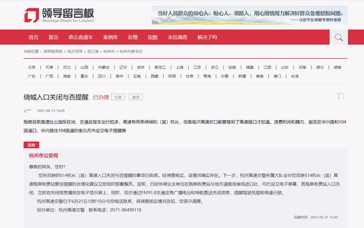 6月15日,有網友在人民網“領導留言板”上留言:“瓶窯目前是遺址公園所在地,交通自駕車出行較多,S14杭長(宜)高速是必經之路,但是每次高速封口都要等到了高速路口才知道。浪費時間和精力,能否在華興路和104國道口,華興路往104國道的南北方向設立電子提醒牌?”