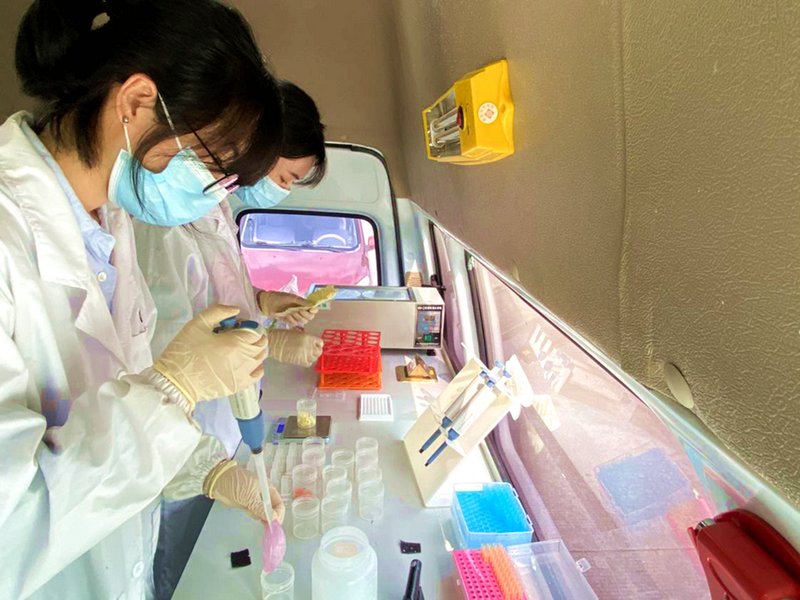 食品安全快速檢測車內,工作人員在對收集到的果蔬樣品進行農殘檢測。人民網 方彭依夢攝