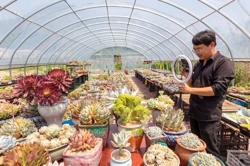 村民以現成的花卉苗木開展直播帶貨。蔡文斌攝