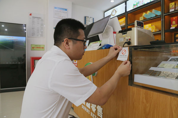 普陀區煙草專賣局專賣執法人員正在張貼禁止向未成年人售煙警示標語。蔣夢婷攝
