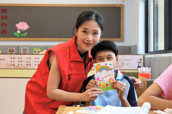 “星空”志愿服務隊員和特教中心的孩子們一起制作教師節賀卡。俞文君攝