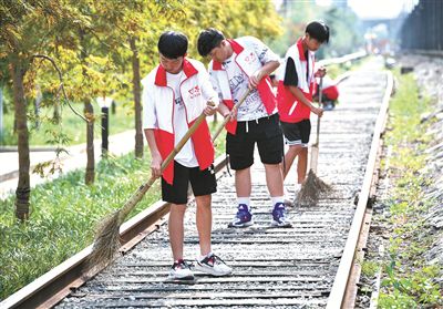 志愿者在鸝西走廊清掃火車鐵軌。嚴龍、蔡夢珠攝