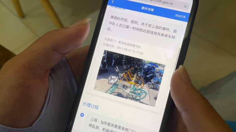 “送貨路上我看到華星路工專路口共享單車停放很雜亂,占用了非機動車道,馬上通過‘西湖碼’上報問題,回來路過的時候發現已經排列得整整齊齊了!”快遞員朱大哥對“西湖碼”的處置效率點贊。