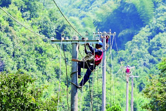 9月3日,在金華婺城區莘畈鄉學嶺頭村的深山溝,一條全新的380伏電力架空線路沿山而上,電力工人正在電線桿上作業。石斑魚生態養殖是婺城區莘畈鄉鄉村振興產業化項目之一,項目建成將有利于帶動集體增收、百姓致富。日前,基地建設遇到了缺電難題,當地政府與電力部門主動對接。經過電力工人連續奮戰,一條380伏電力架空線路沿山飛架而上,延伸到了石斑魚生態養殖基地,提供了電力保障。(胡肖飛)