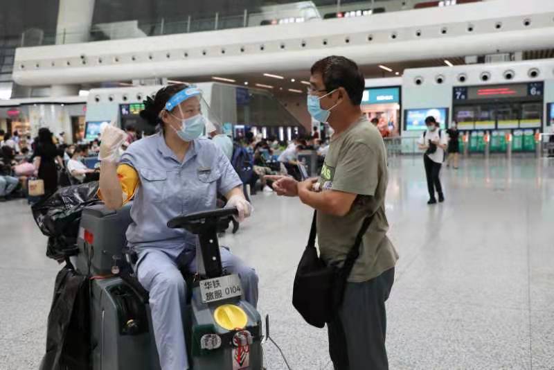 保潔崗位“義警”隊員工作中回答旅客問詢。杭州鐵路公安供圖