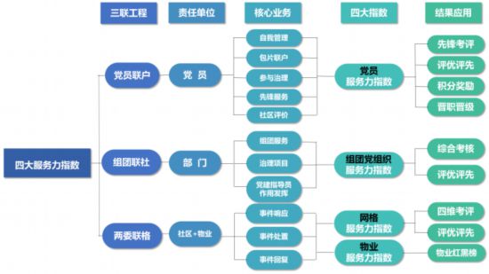 黨員服務力指數是關鍵指數,它主要反映小區黨員在本小區是否發揮模范帶頭作用,服務小區治理的工作情況及成效。它由基礎分、靜態加分、動態加法、負向扣分組成,是小區黨員年底先鋒考評、評優評先、積分獎勵、晉職晉級的重要依據。黨員報道、亮身份獲基礎分,擔任小區業委會、小區支部干部獲靜態加分,參與聯戶、聯樓、聯事獲動態加分,違反“十個不”進行負向扣分。