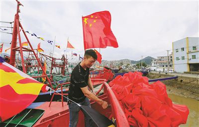漁民為船頭掛上大紅花喜迎開漁。徐能、謝定會攝