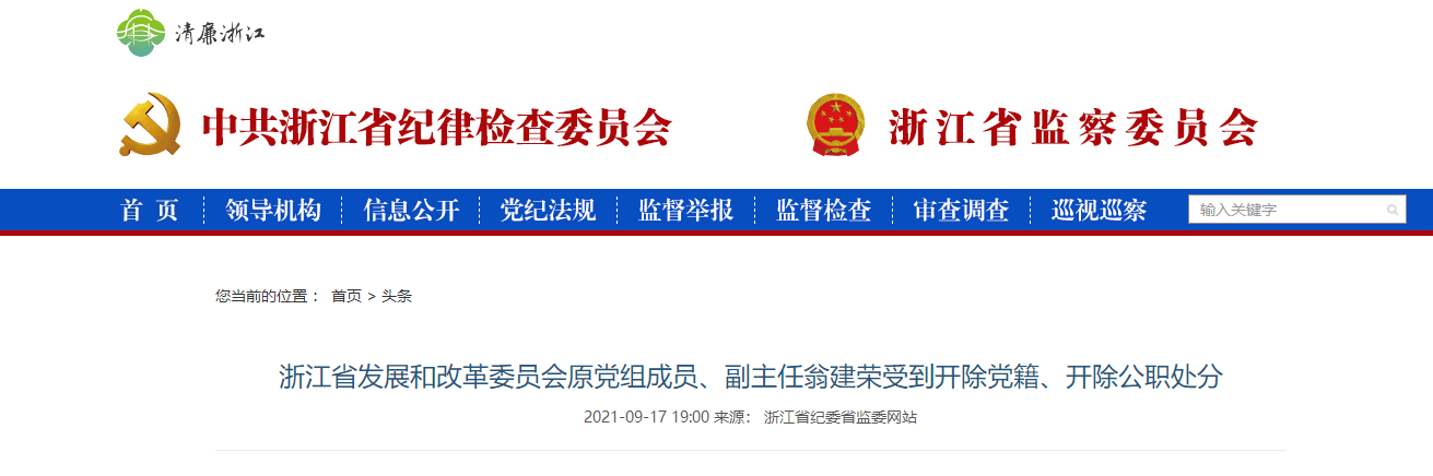 浙江省發展和改革委員會原黨組成員、副主任翁建榮受到開除黨籍、開除公職處分