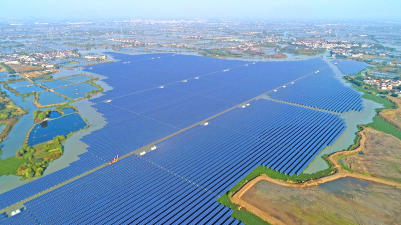 南潯漾東村100兆瓦“漁光互補”光伏發電項目,千年;~塘里鋪滿了光伏板,光伏板發電“生金”,光伏板下魚翔淺底,一地兩用、畝均效益高,當地村民增收共富之路越走越寬。王佳攝