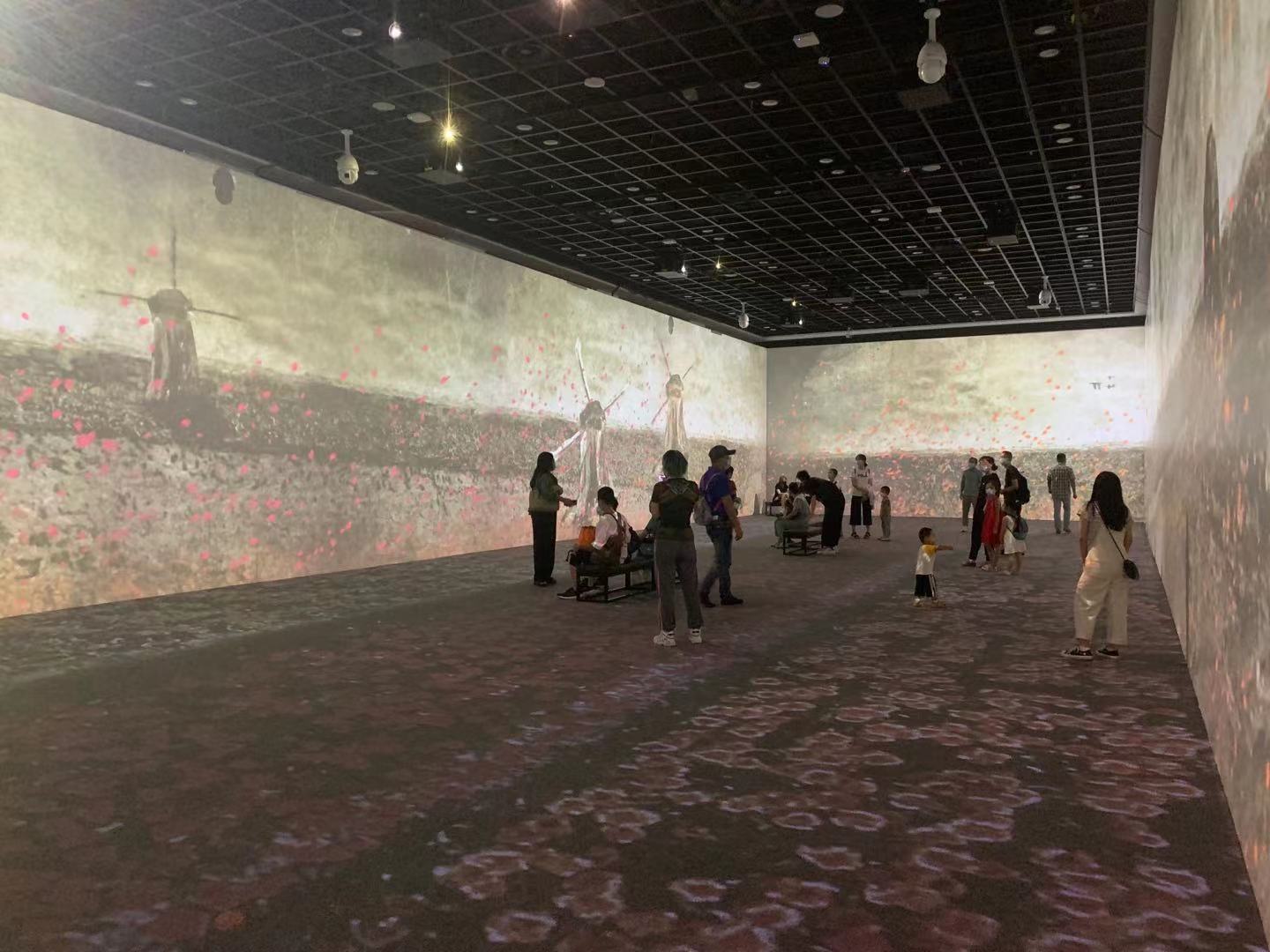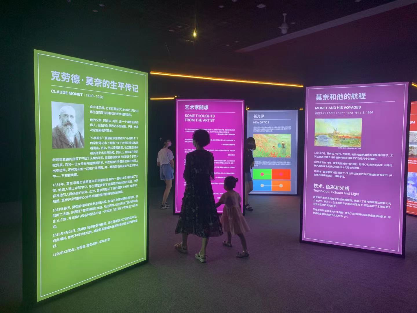 “莫奈是‘追光藝術大師’,我們利用300多平方米的沉浸式主廳,制作了30多分鐘的高科技全息全景影像,將他的作品分為春夏秋冬四個主題,讓觀眾可以全方位體驗并穿行在莫奈描繪的春夏秋冬美景里!蹦嗡囆g沉浸式體驗負責人譚甯說。