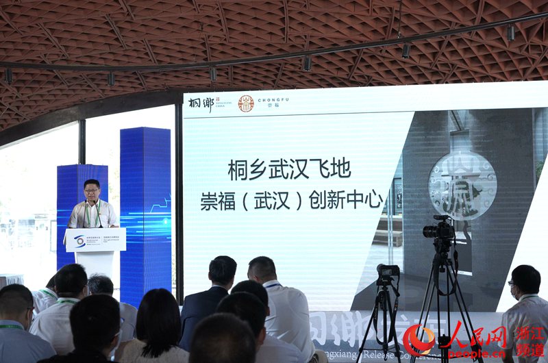 桐鄉市崇福鎮鎮長陳凌鋒介紹崇福(武漢)創新中心。人民網 方彭依夢攝