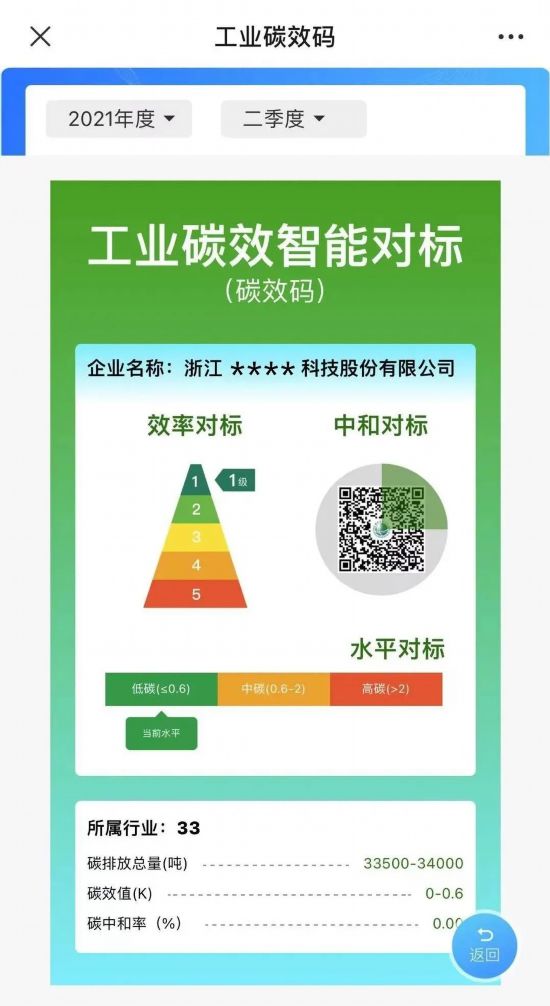 歸集企業主要能源品種消費和加工轉換消費等數據,通過工業碳平臺整合分析,分行業、分地區測算匯總碳排放量數據。聯合建立碳效智能對標體系,圍繞企業碳排放水平、碳利用效率、碳中和情況,開展三大指標智能對標,動態立體給企業“碳畫像”,形成了融合三個標識于一體的“碳效碼”。并創新“企業碼+碳效碼”雙碼融合,在“企業碼”專區開通“碳效碼”,實現企業碳效查詢“一碼了然”。