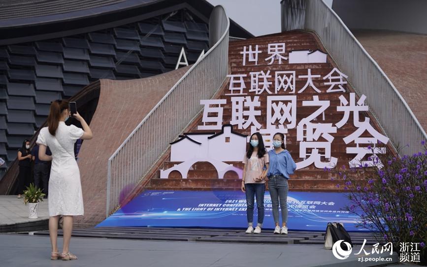參加互聯網之光博覽會的游客留影。人民網 郭揚攝
