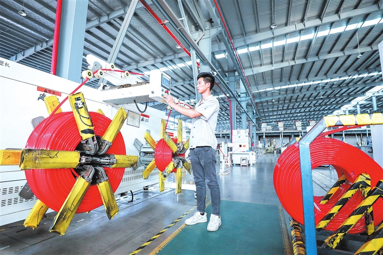 湖州南太湖新區一公司生產車間,工作人員日前在趕制出口柬埔寨、菲律賓的訂單產品。該企業引入先進生產設備和技術,研發、生產新型塑料管道,拓展網絡和傳統銷售渠道,開拓共建“一帶一路”市場,外貿增長同比去年提升64%,預計今年產值可達6億元。(陸一平)