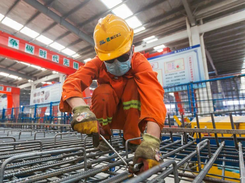 智慧梁場鋼筋加工區工人潘迪欣正在工作。杭紹甬指揮部供圖