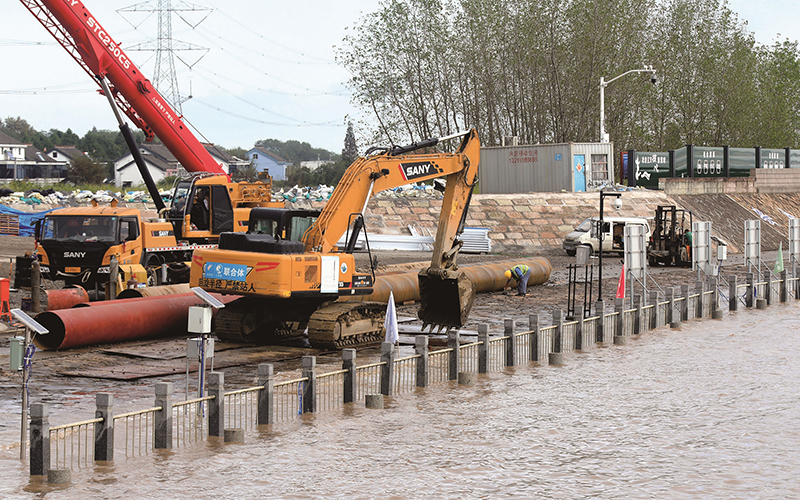 10月10日下午,錢塘江大潮剛過一個小時,施工人員就在與潮水幾乎齊平的嘉興“魚鱗石塘”試驗段海塘塘面上加緊作業。作為浙江省“海塘安瀾千億工程”重要項目之一,錢塘江北岸嘉興周王廟鎮秧田廟至尖山新區塔山壩段海塘工程堤腳加固項目,規劃總投資5.88億元,加固堤腳16.5公里。(沈達)