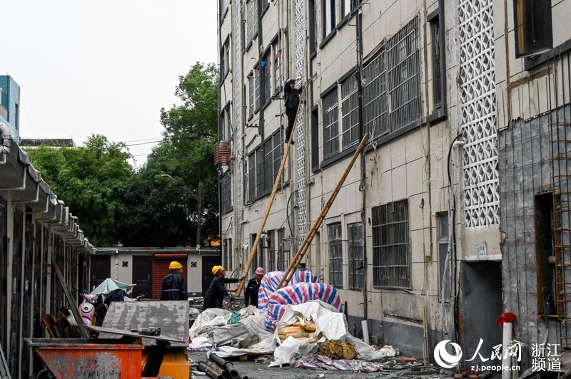 工人正在對該樓進行排危加固。人民網 葉賓得攝
