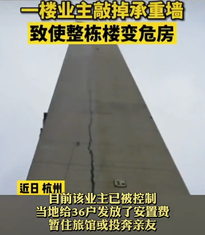 此事發生在杭州市蕭山區瓜瀝鎮商貿公寓31幢。今年8月,該樓一樓業主在裝修時擅自敲掉屋內承重墻,給房屋造成極大安全隱患。