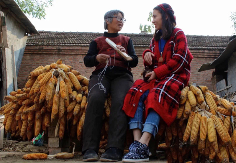 艾晨與奶奶交流布鞋制作工藝。受訪者供圖