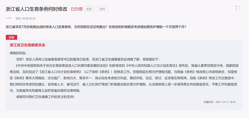 針對相關問題,浙江省衛生健康委員會在10月11日對該條留言進行了回復:《中共中央 國務院關于優化生育政策促進人口長期均衡發展的決定》和新修改的《中華人民共和國人口與計劃生育法》頒布后,浙江省認真貫徹落實中央、國家的政策法規,及時啟動了三孩配套政策的制定工作。目前,相關部門正在起草貫徹落實中共中央、國務院關于優化生育政策促進人口長期均衡發展的決定的實施意見,修改《浙江省人口與計劃生育條例》,預計近期能夠頒布。針對類似該網友這類的三孩家庭,需待浙江省三孩生育政策和配套支持措施出臺后,可按新出臺的政策法規認定落實。