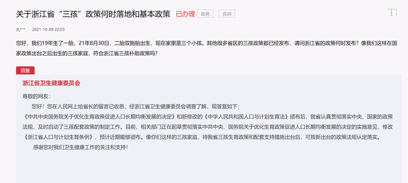 在育兒方面,同樣備受關注的還有“三孩”生育政策的落地情況。今年5月31日召開的中共中央政治局會議指出,進一步優化生育政策,實施一對夫妻可以生育三個子女政策及配套支持措施,有利于改善我國人口結構、落實積極應對人口老齡化國家戰略、保持我國人力資源稟賦優勢。目前,“三孩政策”落地近5個月。10月9日,有網友就浙江省“三孩政策”何時落地等問題在人民網“領導留言板”上留言。