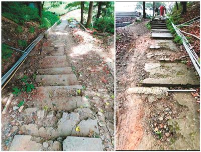 “其實正常情況下,青石板不會那么容易破損。但因為就這么一條路來來回回,這里農忙的時候,茶農的運輸量比較大,村民還會雇傭騾馬上山。這樣積年累月重力踩踏加上風吹雨淋,青石板階梯就破損得特別厲害!