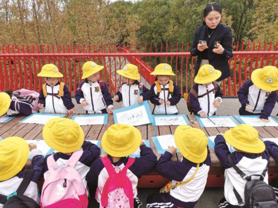 10月25日上午,嘉興市區一家幼兒園組織小朋友來到嘉興西南湖的鴛鴦廊橋開展寫生活動。孩子們在老師的帶領下看嘉興蝶變,畫金秋美景,用稚嫩的畫筆表達對家鄉的熱愛。(王少軍)