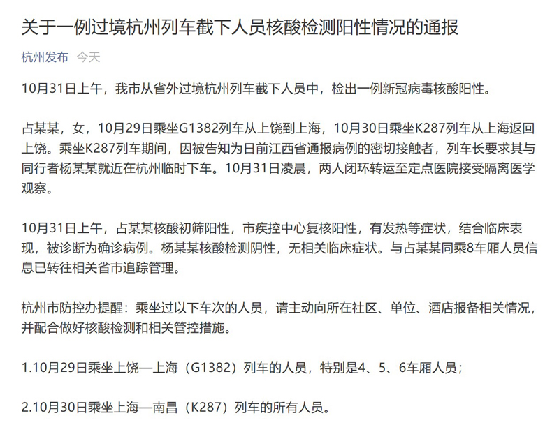 杭州市新冠肺炎疫情防控指揮部發布消息,10月31日上午,杭州從省外過境杭州列車截下人員中,檢出一例新冠病毒核酸陽性。