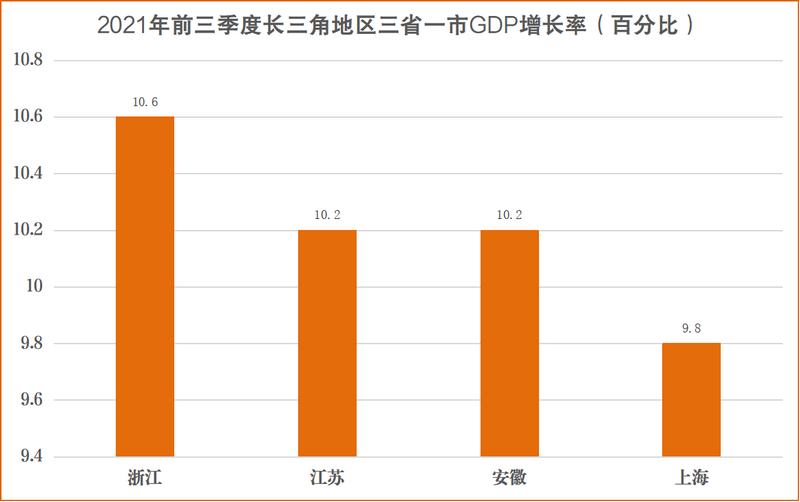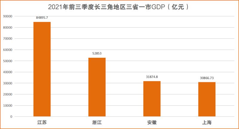 從發布的數據來看,前三季度,江蘇GDP達到84895.7億元,同比增長10.2%;浙江GDP為52853億元,同比增長10.6%;安徽GDP為31874.8億元,同比增長10.2%;上海GDP達30866.73億元,同比增長9.8%。長三角GDP總量依然領跑全國城市群。