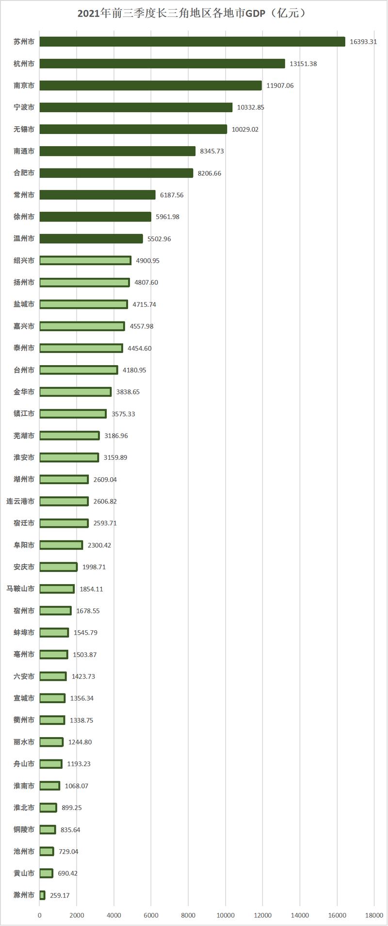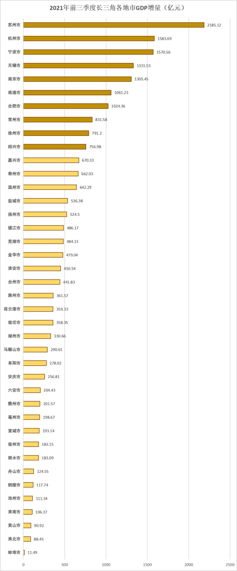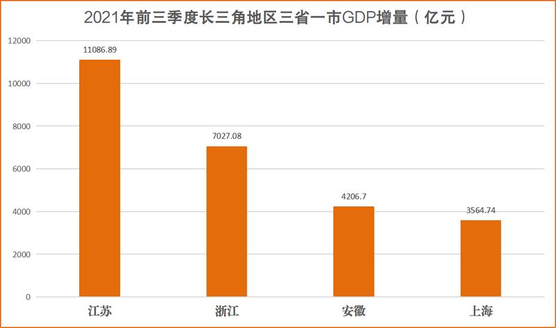 長三角各地市GDP增量排名中,蘇州市、杭州市、寧波市位列前三甲。2021年前三季度,蘇州市實現GDP增量2185.12億元;前三季度,杭州市實現GDP增量1583.69億元;寧波市前三季度實現GDP增量1570.56億元。