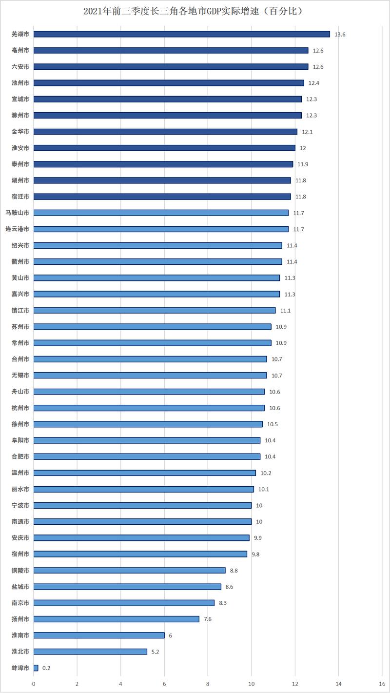 長三角各地市GDP實際增速排名中,蕪湖市、亳州市、六安市位列前三甲。