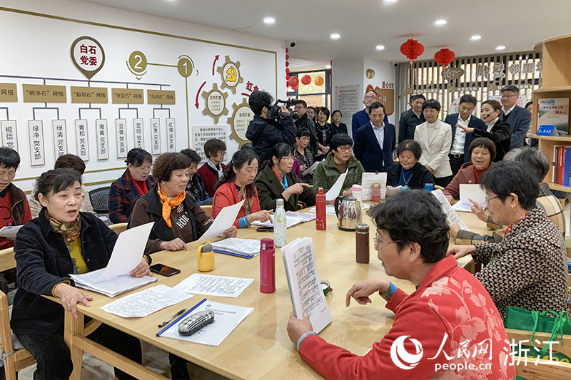 現場考察時,白石社區居民正在支部驛站里排練曲目。人民網 秦文攝