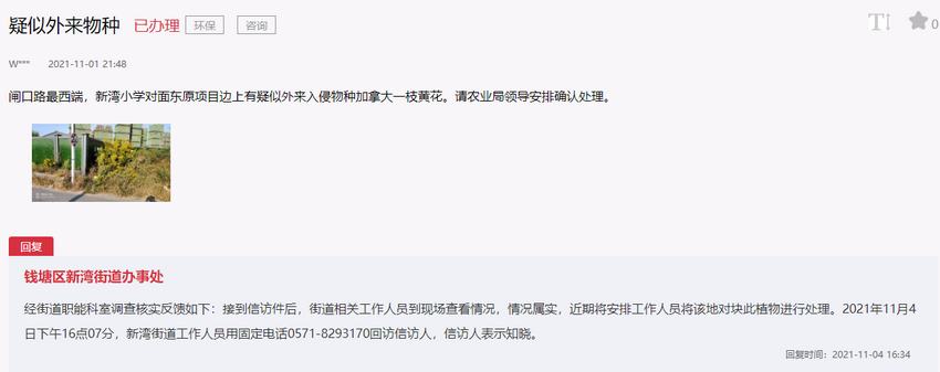 獲悉留言后,杭州市錢塘區新灣街道辦事處第一時間安排工作人員現場確認,發現情況屬實,將安排專業人員對該地塊上出現的此種植物進行處理。