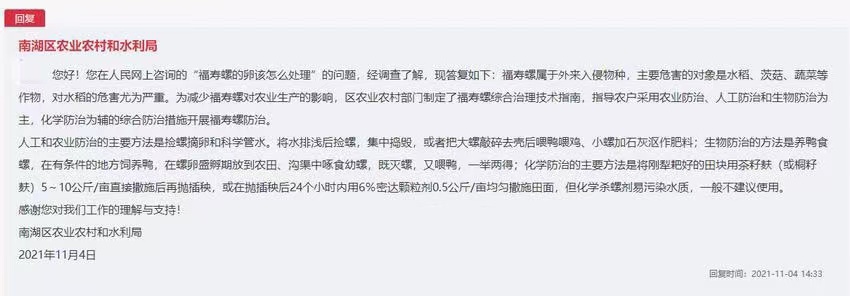 獲悉留言后,南湖區農業農村和水利局在回復中表示,福壽螺屬于外來入侵物種,主要危害的對象是水稻、茨菇、蔬菜等作物,對水稻的危害尤為嚴重。為減少福壽螺對農業生產的影響,南湖區農業農村部門制定了福壽螺綜合治理技術指南,指導農戶采用農業防治、人工防治和生物防治為主,化學防治為輔的綜合防治措施開展福壽螺防治。