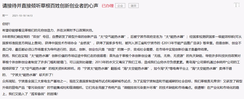 幸運的是,馮先生在困難中挺了過來,如今更是響應節能減碳的號召,研發了轉型升級的廚電產品“零污染排放”的節能集成灶和吸油煙機,克服了傳統產品“油煙排放污染室外環境”的技術缺陷和市場痛點。但這一產品在產業化和市場化的路上走得并不順暢。為此,馮先生在人民網“領導留言板”給寧波市委書記留言,希望能獲得幫助。