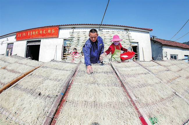 11月11日,湖州市長興縣和平鎮毛家店村番薯粉皮合作社的村民在晾曬紅薯粉絲、粉皮,預計年產值可達80萬元。該村“一村一品”因地制宜,以“合作社+農戶”模式,形成山芋種植、淀粉制作、粉絲加工、運輸銷售的完整產業鏈,鋪就富民強村“銀絲路”。(陸一平、王潔涵)
