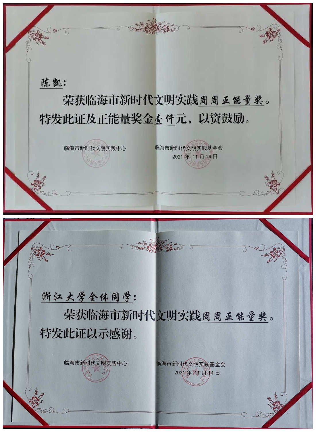 11月14日,一張由臨海市特別頒發的“周周正能量獎”證書送到了陳凱手上,表彰他的這份擔當以及對祖國的拳拳之心、殷殷深情。同時,臨海市政府還準備了另一張抬頭為浙江大學全體同學的“周周正能量獎”證書。據悉,這張凝聚著“滴水之恩涌泉相報”的榮譽證書,已于當天通過郵遞的方式寄往杭州。浙江大學方面表示,已收到證書。