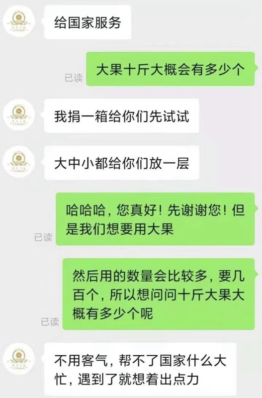 “給國家服務,我捐一箱給你們先試試!薄皫筒涣藝沂裁创竺,遇到了就想著出點力!苯,一段浙大學生與蜜橘商家的聊天記錄在校園論壇上火了,同時還帶火了這家銷售蜜橘的網店。隨即,“浙大博士生和蜜橘商家的聊天記錄”沖上熱搜第一。網友們表示非常感動:“我們國家真的有最好的人民!”