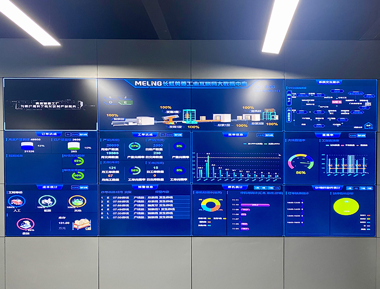 創新智能的產品離不開其生產的數字化、智能化改造。訂單、工單、效率、直通率、成本、預警、線體OEE、物料……與工廠生產線直接關聯的9個維度的數據正通過直觀的圖表顯示在長虹美菱工業互聯網大數據中心的大屏上。