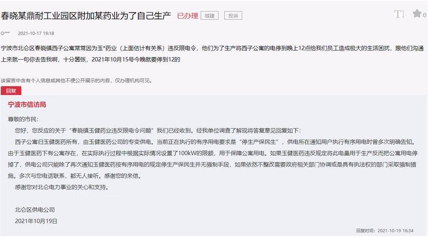 對此,寧波市信訪局在回復中表示,當前正在執行的有序用電要求是“停生產保民生”,供電所在通知用戶執行有序用電時曾多次明確告知。如果該企業違反規定為了生產反而把公寓用電停掉了,供電公司將再次通知其遵守有序用電的規定,如果依然不整改,政府相關部門將進行協調或通知具有執法權的部門采取強制措施。
