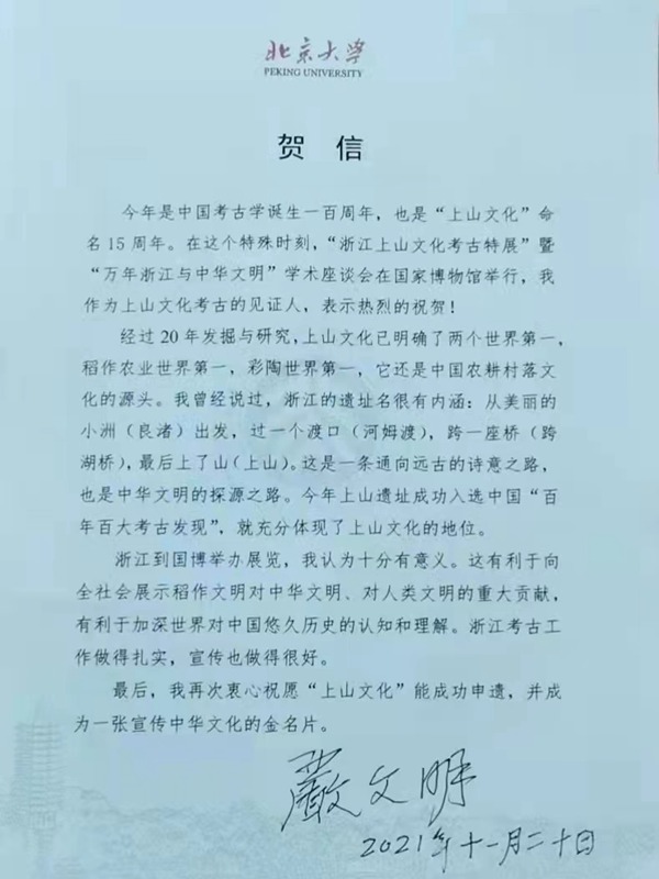 嚴文明為“萬年浙江與中華文明”學術座談會致賀信。