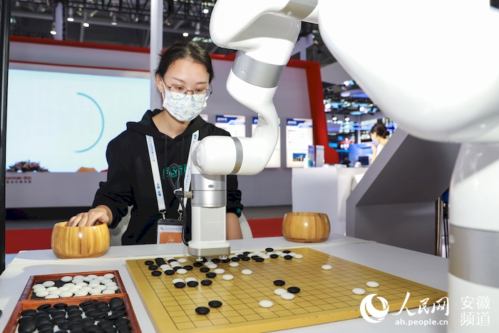工作人員與科大訊飛iFlyGo(飛狗)弈棋機器人下圍棋。人民網 張俊攝