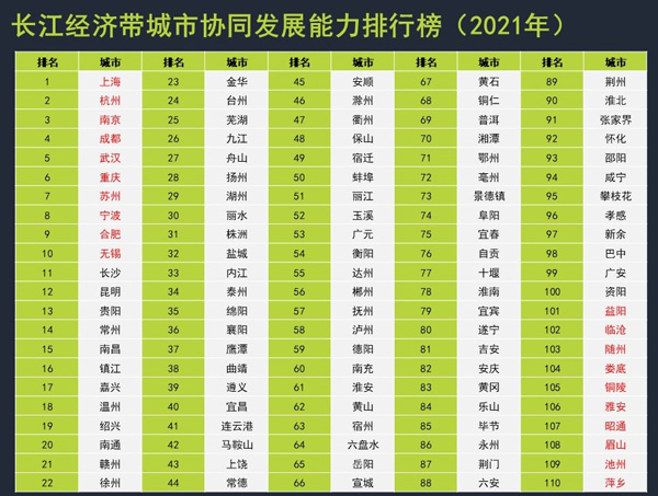 長江經濟帶城市協同發展能力指數(2021)表明,協同發展能力前十強城市依次為:上海、杭州、南京、成都、武漢、重慶、蘇州、寧波、合肥、無錫。益陽、臨滄、隨州、婁底、銅陵、雅安、昭通、眉山、池州、萍鄉則位列排行榜的后十名。宜賓成為最大黑馬,從2020年的104名躍居2021年的第79名。