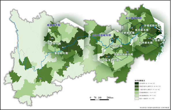 都市圈協同發展能力高度分化。長江下游地區是協同發展能力高值集聚區,中上游地區則相反。從城市群、都市圈的角度看,位居長三角城市群的蘇錫常、南京、杭州、寧波都市圈協同發展能力指數綜合得分高達20.77,遠遠高于武漢都市圈的10.94、環鄱陽湖都市圈的10.33、環長株潭都市圈的9.95、成都都市圈和重慶都市圈的11.51,沿海和內地二大群體相差一倍左右。推動長江經濟帶上中下游城市協同發展,仍是需要解決的重大課題。