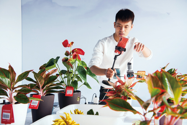 11月27日,在金華市金義新區澧浦花木城,第十九屆中國(金華)花卉苗木博覽會直播間,主播正在網上銷售花卉盆栽、佛手鮮果。結合花木產業數字化發展,此次博覽會設立花木電商直播間,邀請多家線上平臺主播參與花木直播帶貨,線上銷售盆景、佛手、精品花木,助力苗農增收。(時寬兵)