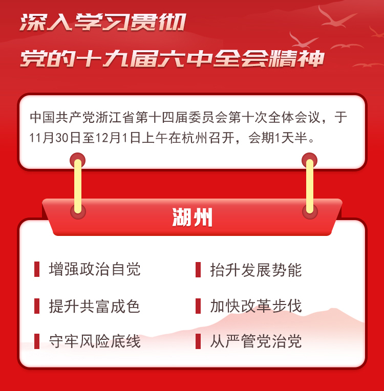 湖州今后又該如何更好地貫徹落實黨的十九屆六中全會精神和浙江省委全會精神?全會指出,需要從六個重點方面“下功夫”:
